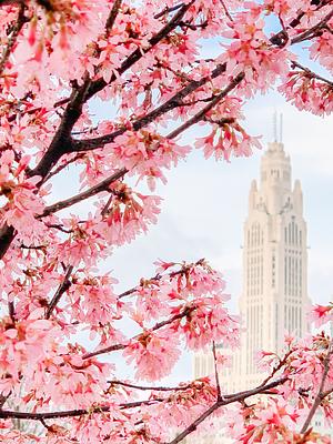 Cherry blossoms frame the iconic LeVeque Tower in the Columbus skyline. We love you, Columbus!
